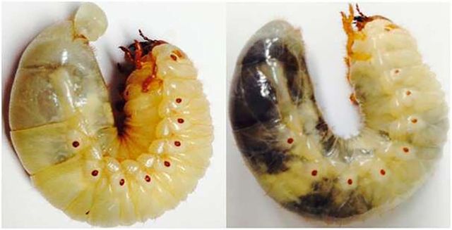 오리테스 바이러스에 감염된 장수풍뎅이 애벌레(왼쪽)와 정상 애벌레. / 농촌진흥청