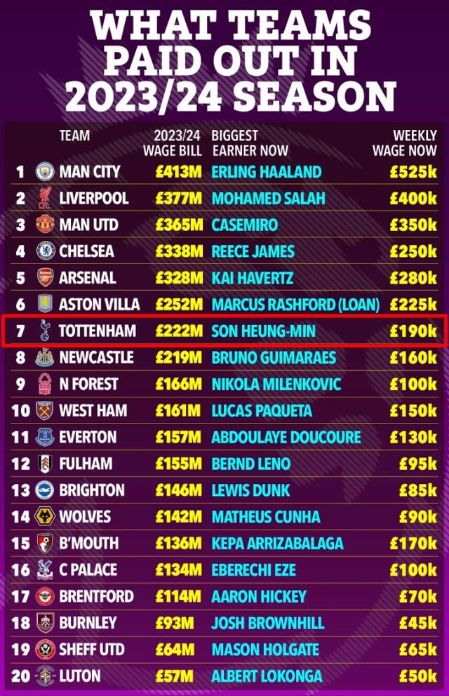 매체는 올시즌 프리미어리그 팀들의 연봉 지출액 총액을 토대로 순위를 매겼고, 각 팀에서 가장 많은 급여를 받고 있는 선수를 소개했다. 이때 토트넘 주장 손흥민이 클럽 최고 연봉자인 것으로 확인됐다.