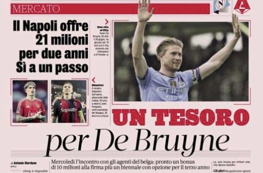 이탈리아 매체 '라 가제타 델로 스포르트'는 지난 26일(한국시간) "더브라위너는 나폴리 이적까지 한 걸음 남았다. 오는 수요일에 에이전트와 미팅을 진행할 것이며 2년에 1년 연장 계약 옵션, 급여는 550만 유로(약 85억원) 수준이 될 것"이라고 보도했다.