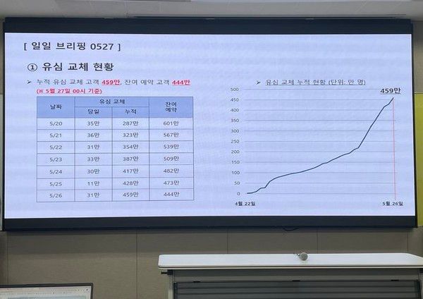 SK텔레콤은 27일 오전 서울 중구 삼화타워에서 해킹 사태 수습 일일브리핑을 열고 "459만명의 유심 교체를 끝냈다. 남은 교체 예약자는 444만명이다."라며 이같이 밝혔다.