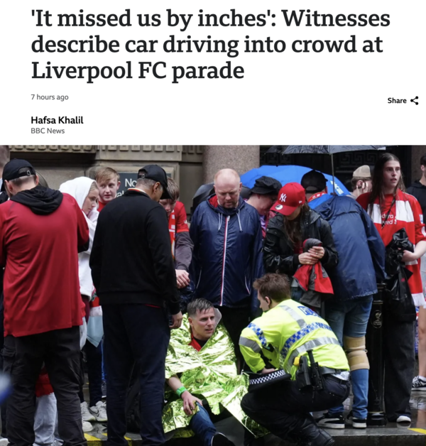 그러나 누군가의 돌발 행동으로 환희의 날이 비극으로 바뀌었다. 리버풀 우승 퍼레이드 버스가 지나가고 10여 분 뒤, 리버풀 출신의 53세 백인 영국인 남성은 차량을 운전하던 도중 급작스럽게 군중들을 향해 차를 몰았다. 현재 그는 머지사이드 경찰에게 체포됐으며, 경찰은 이 사건을 테러가 아닌 우발적 사고로 여긴다.