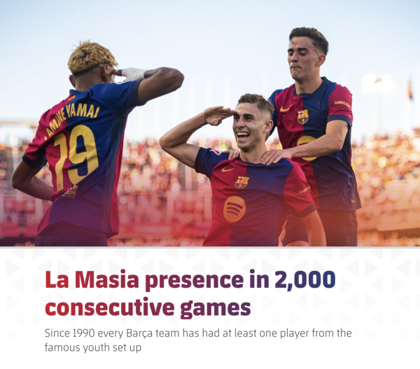 27일(한국시간) 바르셀로나는 공식 홈페이지를 통해 “2,000경기 연속으로 라마시아 출신 선수가 바르셀로나 1군 경기에서 뛰었다. 1990년부터 바르셀로나는 유소년 팀에서 나온 선수를 최소 한 명은 기용했다”라고 밝혔다.