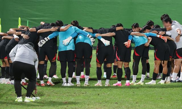 대한민국 U-22 축구대표팀이 공개 훈련을 하면서 파이팅을 외치고 있다. 기사 이해를 돕기 위한 자료 사진 / 연합뉴스
