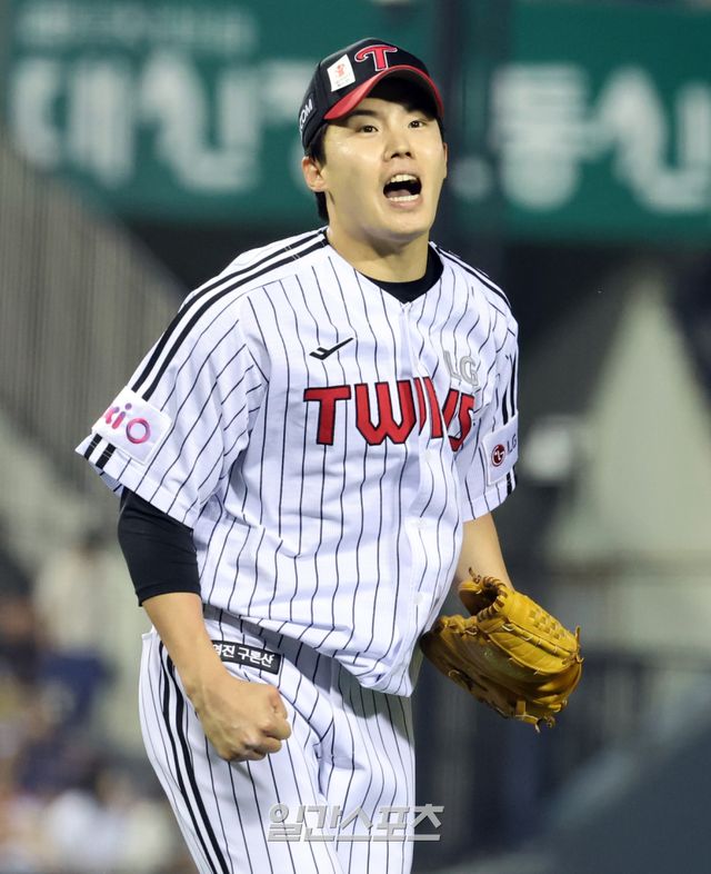 LG 트윈스 임찬규(33)는 7회 초 수비를 마치고 더그아웃으로 들어오며 포효했다.
