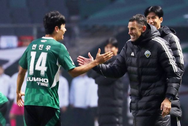 지난 2월 전북자치도 전주시 전주월드컵경기장에서 열린 하나은행 K리그1 2025 전북현대와 김천상무의 경기에서 전북 전진우가 역전골을 넣고 거스 포옛 감독과 기쁨을 나누고 있다. / 뉴스1
