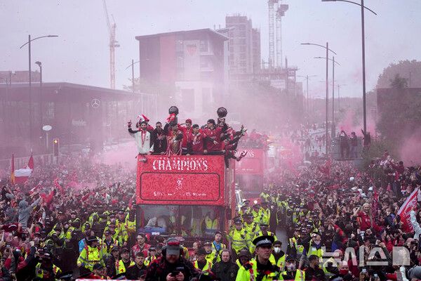 리버풀시내 워터스트리트 거리에는 경찰이 쳐놓은 금지선과 축하행사에 필요한 물병과 깡통들, 리버풀 시 깃발 등이 흩어져 있는 길 위에 파란색 텐트가 아직도 남아있다.