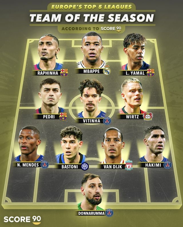 축구 콘텐츠 매체 스코어90은 27일(한국시간) 2024~25시즌 5대 리그 베스트11을 선정했다. 이번 시즌 가장 뛰어난 활약을 펼친 5대 리그 선수 11명을 꼽은 것이다.