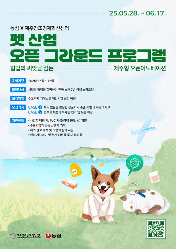 제주창조경제혁신센터는 농심과 함께 제주지역을 기반으로 펫 산업 확장을 위한 오픈이노베이션 사업인 ' 펫 산업 오픈그라운드 프로그램'을 시작한다고 28일 밝혔다.