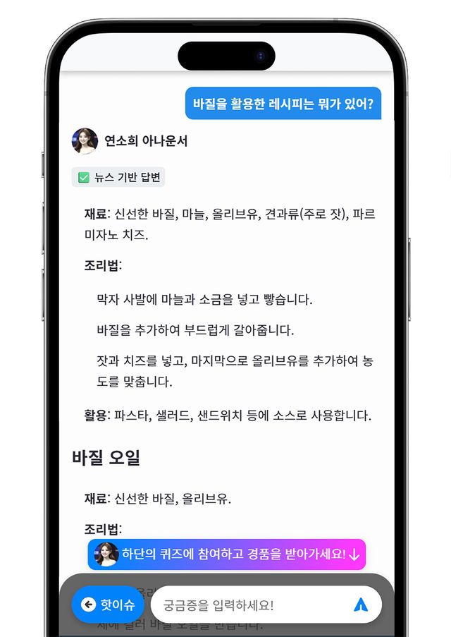 예를 들어 “드라마 '천국보다 아름다운'의 줄거리 알려줘” 또는 “바질을 활용한 레시피는 뭐가 있어?”, “가장 최근 대선 후보 여론조사 결과가 궁금해”와 같이 자유롭게 질문해 보자.