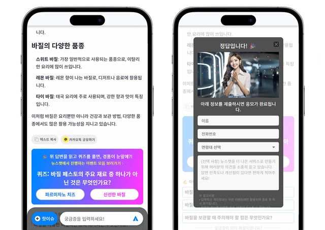 질문에 대한 답변과 함께 뉴스챗이 간단한 퀴즈 하나를 제시할 것이다. 뉴스챗의 답변 내용만 잘 살펴보면 쉽게 맞힐 수 있는 퀴즈이기 때문에, 2개의 버튼 중 정답을 누르면 된다. 정답을 맞히면 이벤트 참여를 위한 개인정보 입력 창이 뜨게 되며, 혹시 정답을 맞히지 못했더라도 3초 정도만 기다리면 다시 정답을 맞힐 수 있는 기회를 얻게 된다.