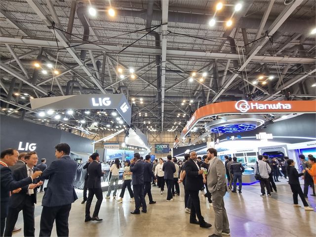 전시장 입구에 들어서자마자 LIG넥스원·HD현대중공업 통합 부스와, 그 맞은편의 한화그룹 3사 부스가 대적하듯 배치돼 관람객들의 눈길을 끌었다.