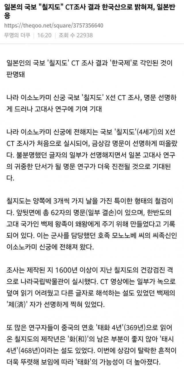 일본의 국보 "칠지도" CT조사 결과 한국산으로 밝혀져, 일본반응
