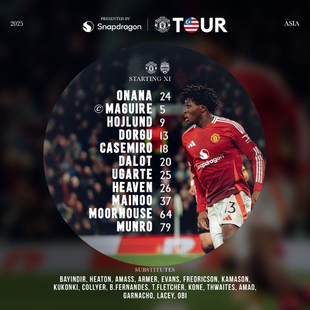 하프타임에 맨유는 대거 선수를 바꿨다. 톰 히튼 골키퍼를 비롯해 타일러 프레데릭슨, 에반스, 갓윌 쿠콘키가 백3르를 갖췄다. 중원은 타일러 플레처, 토비 콜리어가 지켰고 윙백에 해리 아마스, 아마드 디알로가 나섰다. 2선에 브루누 페르난데스, 가르나초, 최전방에 치도 오비가 나왔다.
