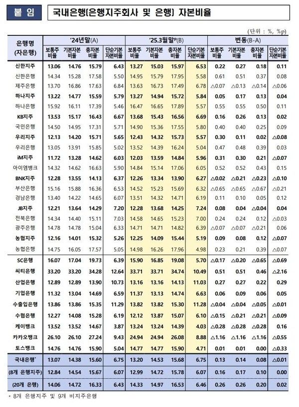 이어 "국내 경기회복 지연, 미국 관세 정책 불확실성 등 대내외 리스크 요인이 지속되고 있으므로 충분한 손실흡수능력이 유지될 수 있도록 모니터링을 지속할 예정"이라고 밝혔다.
