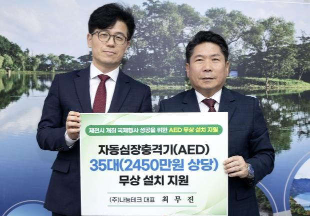 [파이낸셜경제=김영란 기자] 제천시와 ㈜나눔테크는 지난 28일 2025년 제천시에서 개최되는 4개 국제행사의 성공개최를 위해 35대(총 2,450만 원 상당)의 자동심장충격기(AED) 무상 설치지원을 약속했다고 밝혔다.