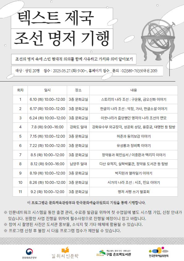 구립 은뜨락도서관이 내달 10일을 시작으로, 2025년 길 위의 인문학 ‘텍스트 제국, 조선 명저 기행’을 운영한다.
