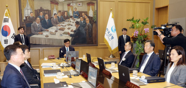 한은은 지난해 10월과 11월 2회 연속 금리를 낮춘 후 1월 올해 첫 금통위에서는 동결을 결정했다. 그러다 2월 다시 금리 인하에 나선 후 4월에는 1500원에 육박하는 고환율과 트럼프 경기 정책 불확실성에 일단 관망하며 동결한 바 있다.