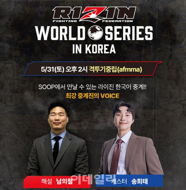 SOOP은 오는 31일 인천 파라다이스 호텔에서 열리는 ‘RIZIN WORLD SERIES IN KOREA(이하 라이진)’를 한국어로 독점 생중계한다고 밝혔다. ‘라이진’은 2000년대 중반 인기를 끌었던 일본 격투기 단체 ‘프라이드 FC’의 후신으로, 아시아를 대표하는 격투기 리그다.
