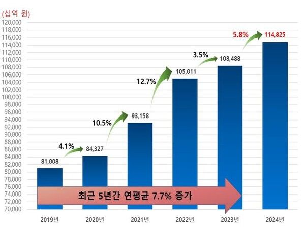 뉴시스 보도에 따르면, 29일 식품의약품안전처와 식품안전정보원이 발표한 '2024년 국내 식품산업 생산실적'에 따르면, 지난해 생산액은 총 114조8252억원으로 전년(108조4875억원) 대비 5.8% 증가했다.
