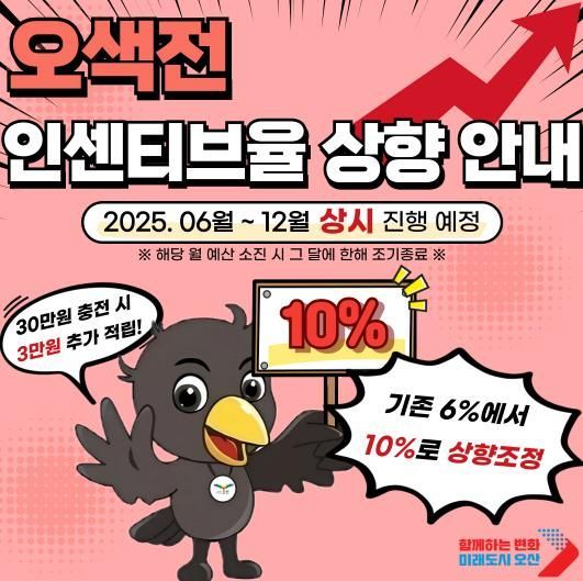 오산시는 이번 인센티브 확대를 통해 시민에게는 실질적인 혜택을, 골목상권에는 안정적인 소비 기반을 제공할 수 있을 것으로 기대하고 있다.