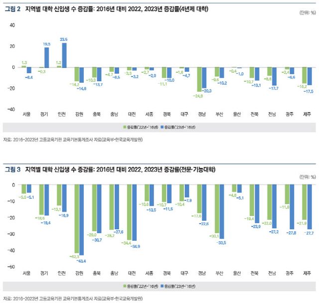 연구에 따르면, 수도권 대학을 제외한 비수도권 대학과 전국 전문·기능의 신입생 규모가 전반적인 감소 추세가 두드러졌다. 전국 대학 신입생 수는 2016년 57만 5000명에서 2023년 50만 4000명으로 약 7만 1000명(12.3%) 감소했다. 이 중 4년제 대학은 같은 기간 1만 8000명(5.2%) 줄었고, 전문·기능대학은 5만 2000명(23.7%)이나 감소해 충격파가 더 컸다.