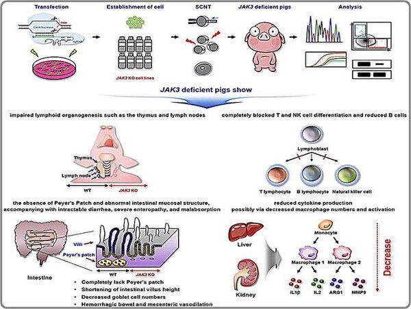 이번에 연구팀은 유전자가위(CRISPR/Cas9)를 활용해 미니돼지 최초로 JAK3(주로 백혈구 등 면역세포에서 발현되는 티로신 키나아제) 유전자를 결손시킨 넉아웃(Knock-Out·유전자결손) 모델을 생산하고 특징을 분석했다. JAK3 넉아웃 미니돼지 생산은 세계 최초다.