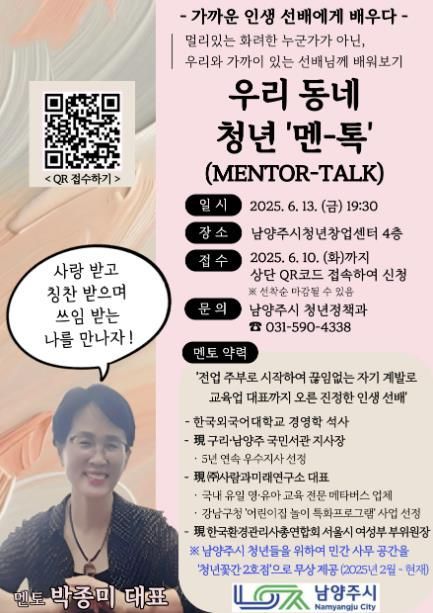 [와이뉴스] 남양주시는 오는 6월 13일 호평동 소재 청년창업센터에서 지역 청년 20여 명과 함께 ‘우리 동네 청년 멘-톡(Mentor-Talk)’프로그램을 진행한다고 29일 밝혔다.