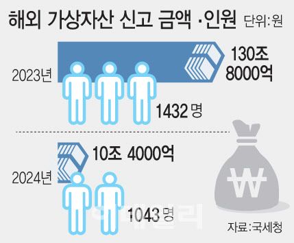 해외금융계좌는 신고 규모가 매년 증가하다 2024년 고꾸라졌다. 2020년엔 2685명이 55조 9000억원을, 2023년엔 5419명이 186조 4000억원을 신고했다. 하지만 2024년엔 4957명이 64조 9000억원을 신고해 전년에 비하면 신고인원은 462명(8.5%), 신고금액은 121조 5000억원(65.2%) 각각 줄었다. 특히 가상자산 신고액은 10조 4000억원으로 전년(130조 8000억원)보다 120조 4000억원 줄어 90%가 사라졌다. 신고인원도 1043명으로 전년보다 27%(389명) 줄었다. 특정 가상자산의 가격이 폭락했던 영향이다.