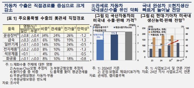 우선 장·단기 경로와 관련 여건을 감안하면 자동차 수출이 가장 큰 타격을 받아 GDP 재화수출을 0.6% 낮출 것으로 추정됐다. 한은 측은 “우리 자동차 수출에서 높은 미국 수출비중(지난해 47%)과 25%에 달하는 관세율로 인해 직접경로를 통한 대미수출 부정적 영향이 클 것”이라고 예상했다.