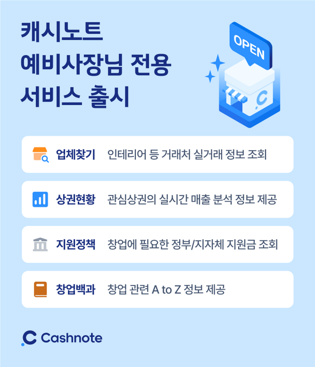 소상공인 경영관리 서비스 ‘캐시노트’를 운영하는 한국신용데이터(KCD)는 자영업 창업 준비를 위한 ‘예비 사장님 서비스’를 출시했다고 29일 밝혔다.