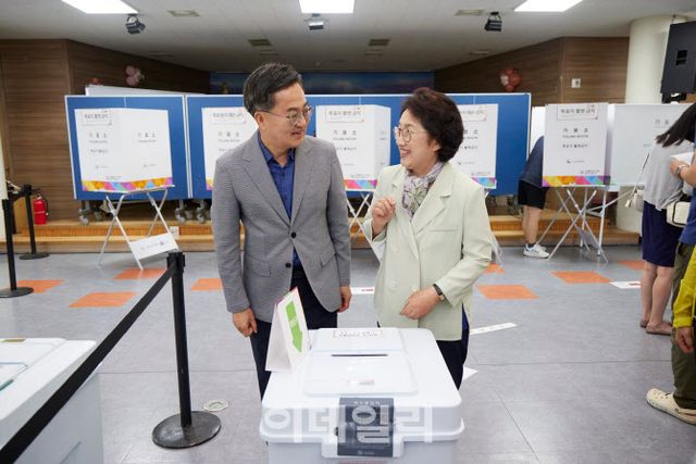 김 지사는 이날 아침 7시 부인 정우영 여사와 수원시 영통구 광교1동 행정복지센터에서 사전투표에 참여했다.