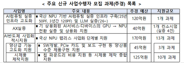 이밖에도 올해 추경을 통해 54억원이 편성된 'AI 반도체 해외 실증 지원사업'은 해외 수요처 협의 등 과제 수행에 필요한 준비 기간을 고려해 지난 16일에 선제적으로 공고됐다. 국산 AI 반도체 기반 디바이스 AX 개발·실증 사업은 내달 중 별도 공고를 통해 수요 기업을 모집할 예정이다.