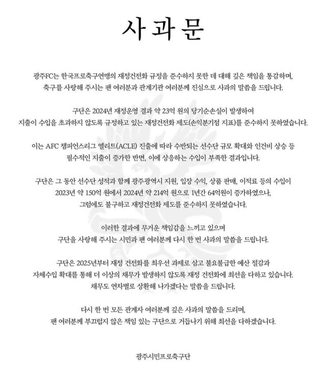 광주FC는 한국프로축구연맹의 재정건전화 규정을 준수하지 못한 데 대해 깊은 책임을 통감하며, 축구를 사랑해 주시는 팬 여러분과 관계기관 여러분께 진심으로 사과의 말씀을 드립니다.