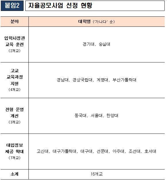 교육부는 이번 사업을 통해 공교육 중심의 대입 운영 정착과 고교 교육과 대학 전형 간 연계 강화에 초점을 맞춘다는 계획이다. 최은희 교육부 인재정책실장은 “학생들이 공교육을 통해 충분히 준비할 수 있는 입시 환경을 만들도록 지속 지원하겠다”고 밝혔다.