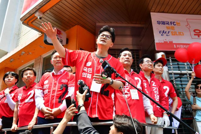한 전 대표는 29일 광주에서 사전투표 후 광주 충장로에서 유세를 실시했다. 한 전 대표는 김문수 후보 이름이 없이 기호 2번이 새겨진 국민의힘 선거운동 유니폼을 입고 지지를 호소했다.