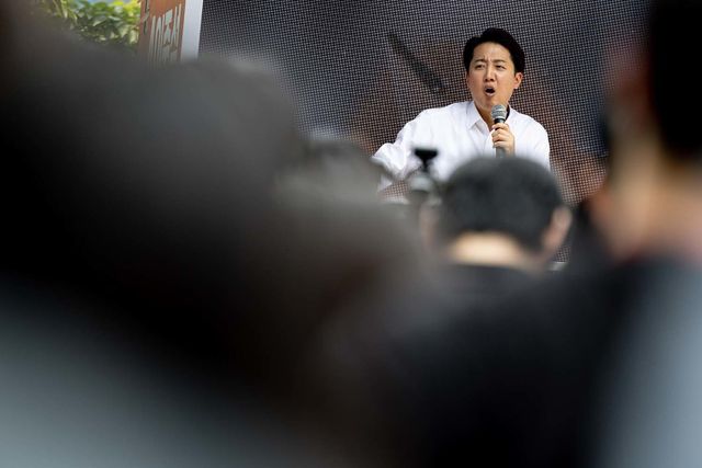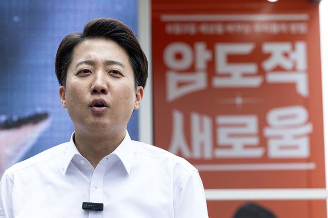 이준석 개혁신당 대통령 후보가 29일 오후 경기도 성남시 분당구 판교유스페이스 야외광장에서 열린 유세를 마친 후 백브리핑을 하고 있다. / 뉴스1