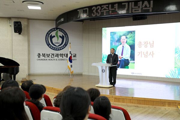 충북보건과학대학교는 개교 33주년을 맞아 29일 대학 미네르바 홀에서 '6개 단과대학 선포식 및 마이스터대학원 개원식'을 했다.