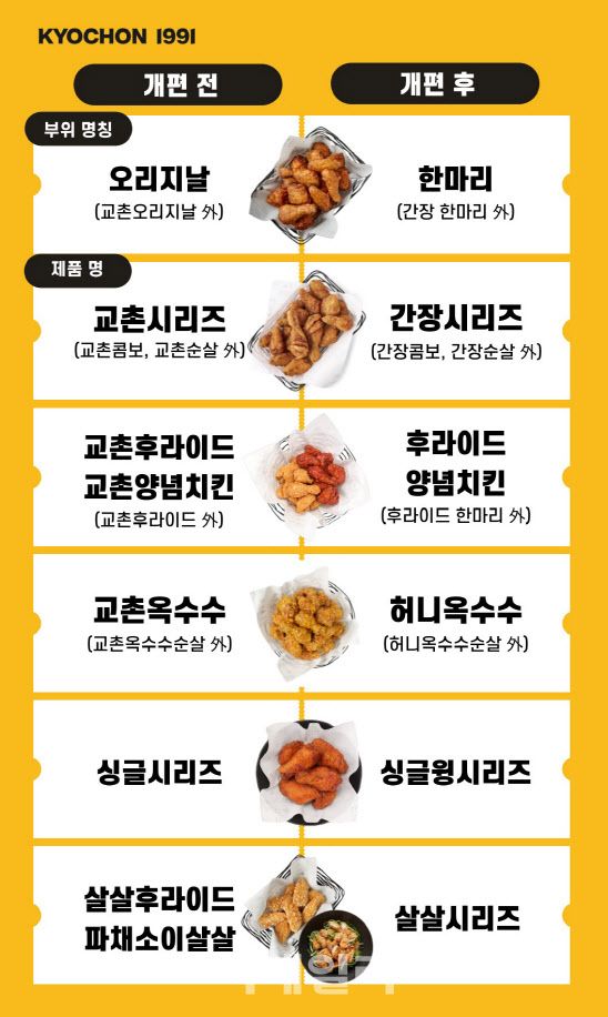 교촌에프앤비 관계자는 “주문 과정에서의 고객과 가맹점 간 소통 편의 향상을 위해 대대적으로 제품명을 개편했다”며 “앞으로도 고객과 가맹점의 목소리를 귀 기울이며 브랜드 신뢰를 더욱 높여가기 위해 노력할 것”이라고 말했다.