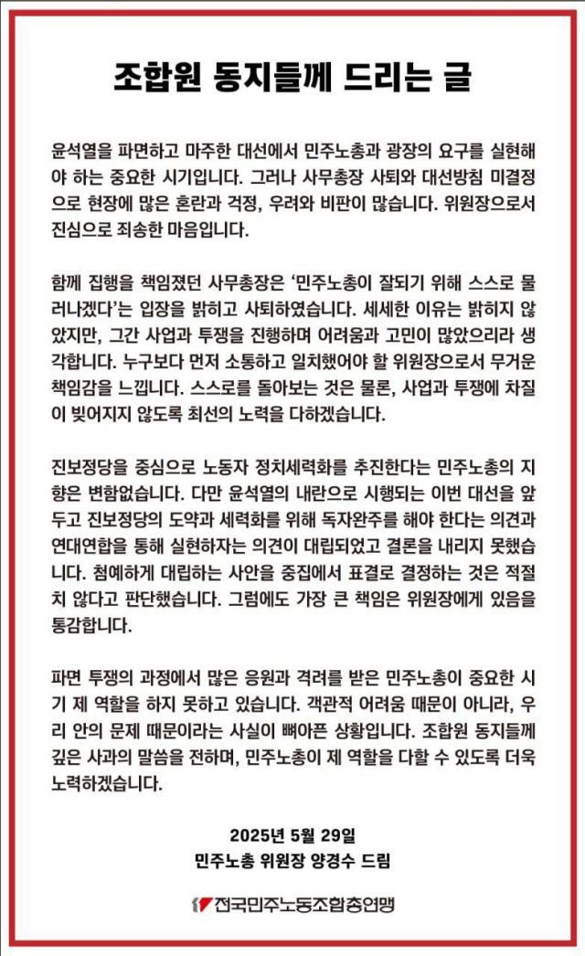 민주노총 내부 비판이 가열되자, 양 위원장은 29일 오후 '조합원 동지들께 드리는 글'을 올려 "윤석열을 파면하고 마주한 대선에서 민주노총과 광장의 요구를 실현해야 하는 중요한 시기"라며 "그러나 사무총장 사퇴와 대선방침 미결정으로 현장에 많은 혼란과 걱정, 우려와 비판이 많다. 위원장으로서 진심으로 죄송한 마음"이라고 밝혔다.