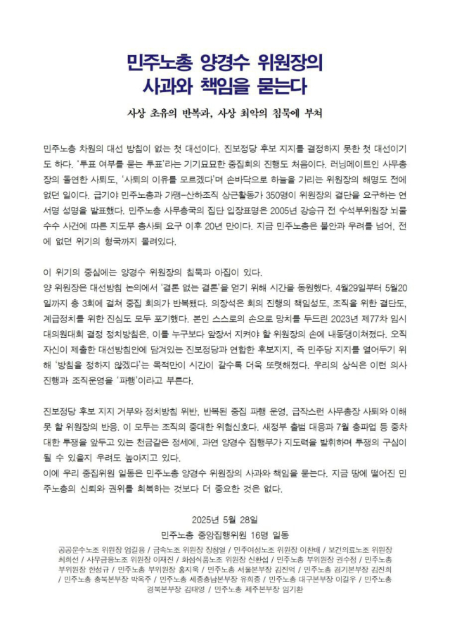 민주노총 중앙집행위원 16명은 지난 28일 공동 성명을 내고 "민주노총 양경수 위원장의 사과와 책임을 묻는다"고 밝혔다. 지난 4월부터 지금까지 6.3 대선 방침을 정하지 못하고 조직 내 내홍이 이어진 데 대해 "이 위기의 중심에 양경수 위원장의 침묵과 아집이 있다"고 비판하며 양 위원장의 입장 표명을 요구했다. 중앙집행위는 민주노총 주요 의결기구의 결정을 집행하는 최고 집행기구다.