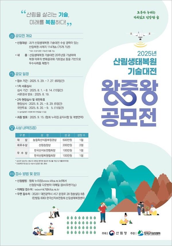 과거 산림생태복원 기술대전에서 수상 경력이 있는 기관 중 참가를 희망하는 기관은 산림청 또는 한국산지보전협회 누리집에서 신청서를 내려받아 7월 27일까지 전자우편이나 한국산지보전협회로 우편접수하면 된다.