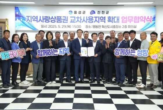 [파이낸셜경제=김영란 기자] 음성군은 29일 맹동면 혁신도시 출장소에서 진천군과 지역사랑상품권 교차사용지역 확대를 위한 업무협약식을 추진했다.