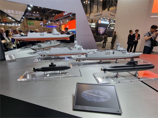 국내함정 섹션에서는 HD현대중공업이 설계 및 건조한 정조대왕급 이지스 구축함과 개발 중인 한국형 차기 구축함(KDDX), 울산급 배치-Ⅲ 선도함인 충남함, 자체 개발한 원해경비함 등을 전시했다.