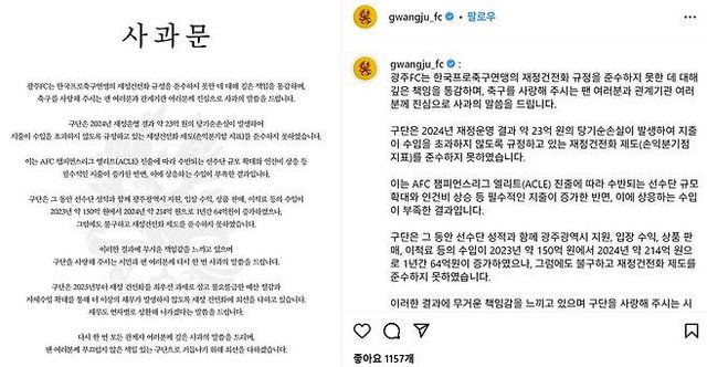 광주 구단은 29일 구단 SNS를 통해 “재정 건전화 규정을 준수하지 못한 데 깊은 책임을 통감하며, 축구를 사랑해주시는 팬·관계기관 여러분께 진심으로 사과의 말씀을 드린다”고 밝혔다.