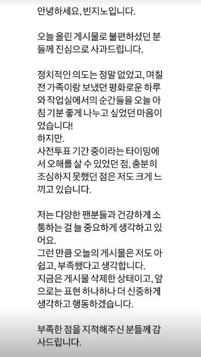 이에 빈지노는 곧바로 "오늘 올린 게시글로 불편하셨던 분들께 진심으로 사과드린다. 정치적인 의도는 정말로 없었고, 며칠전 가족이랑 보냈던 평화로운 하루와 작업실에서의 순간들을 오늘 아침 기분좋게 나누고 싶었던 마음이었다"라며 해명하며 사과했다.