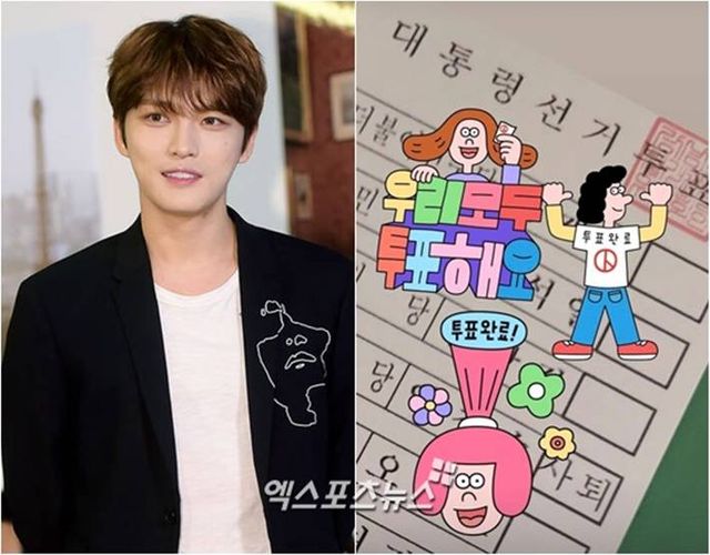 김재중 또한 제20대 대통령 선거 당시 '우리 모두 투표해요' '투표 완료' 등 문구가 적힌 스티커를 추가로 붙여 투표 참여를 독려했다. 그러나 이 도한 기표소 내에서 촬영한 투표 용지였고 선거법 위반이다.