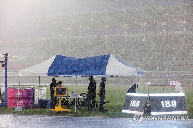 이날 오후 7시 35분 남자 포환던지기 결선부터 진행될 예정이었던 대회장에 오후 7시부터 빗방울이 떨어졌고 폭우로 커져 대회 일정이 다시 중단됐다. 경기장은 또다시 어제처럼 흠뻑 젖었다.