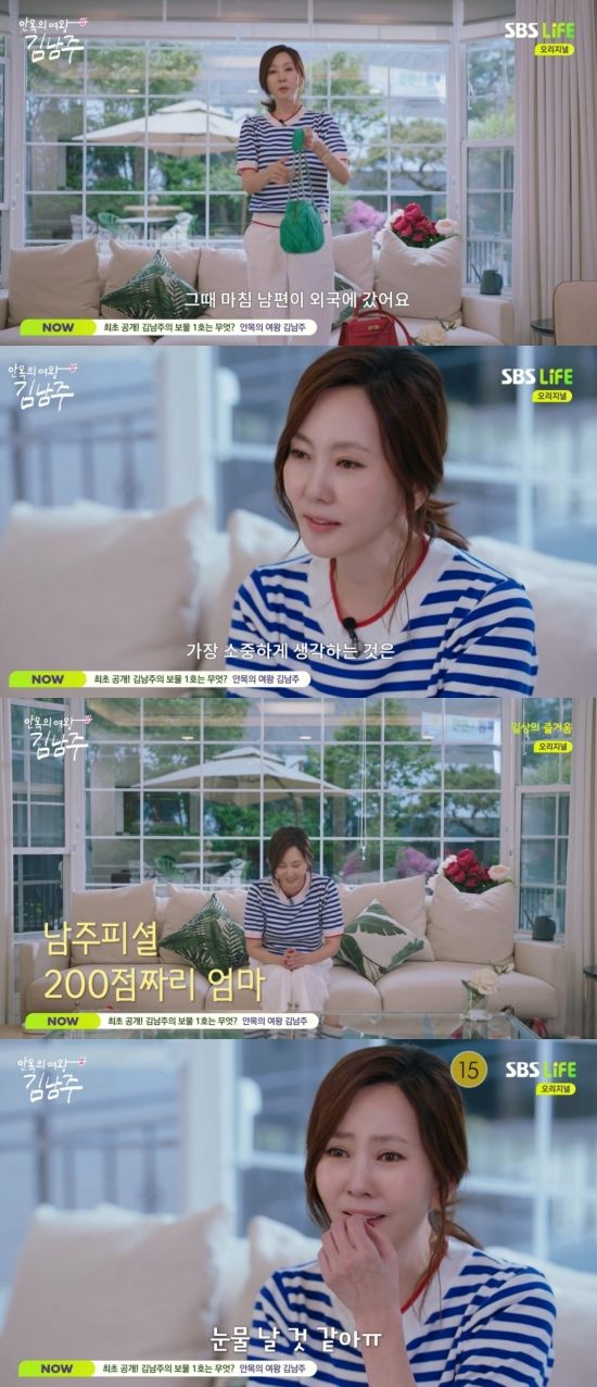이날 남편 김승우에게 선물 받기도 한 고가의 명품 가방들을 포함해 다양한 물건들을 소개한 김남주는 "가장 소중하게 생각하는 것은 트로피도 드레스도 아니다. 2005년에 결혼해서 딸과 아들을 낳고 200점짜리 엄마가 됐다"는 자화자찬으로 웃음을 터뜨리더니 "배우보다는 엄마로서의 삶이 참 행복했다"며 눈물을 글썽였다.