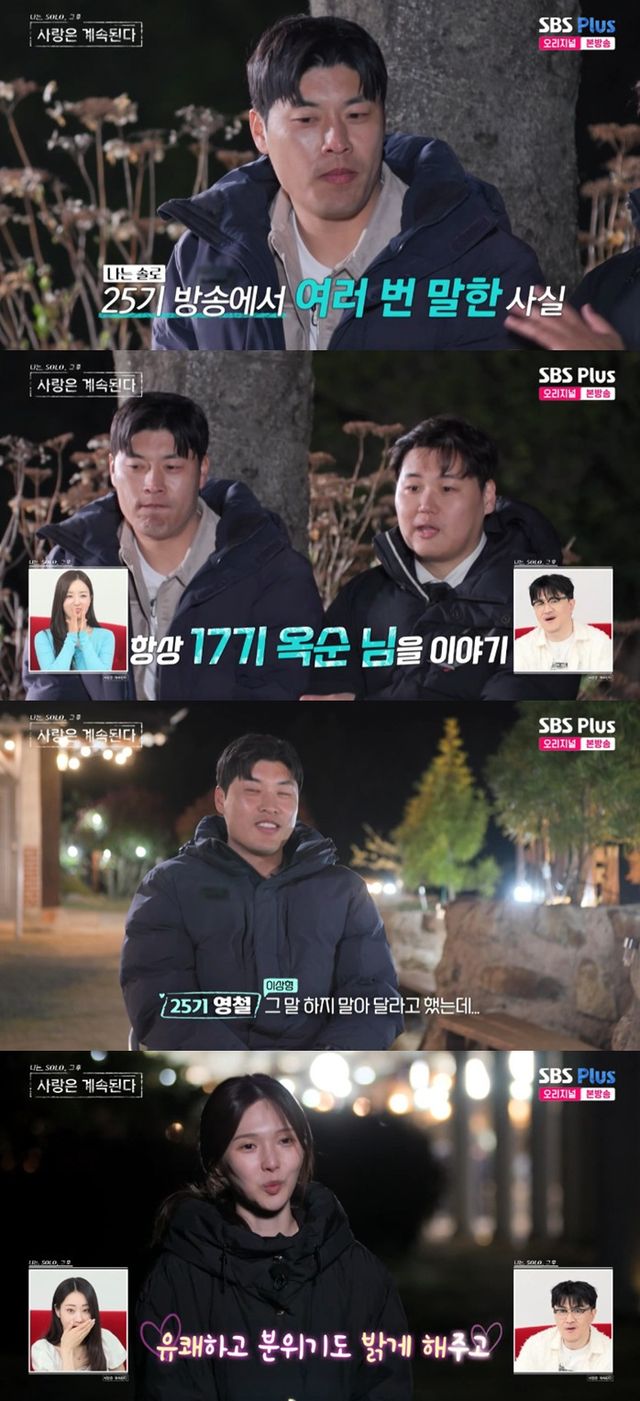 이날 23기 영호는 25기 영철을 소개하며 "중요한 정보만 전달해 드린다"며 "25기 방송에서 여러 번 말하셨다. 이상형을 물어보면 항상 17기 옥순 님을 얘기하셨다더라"라고 전했다.