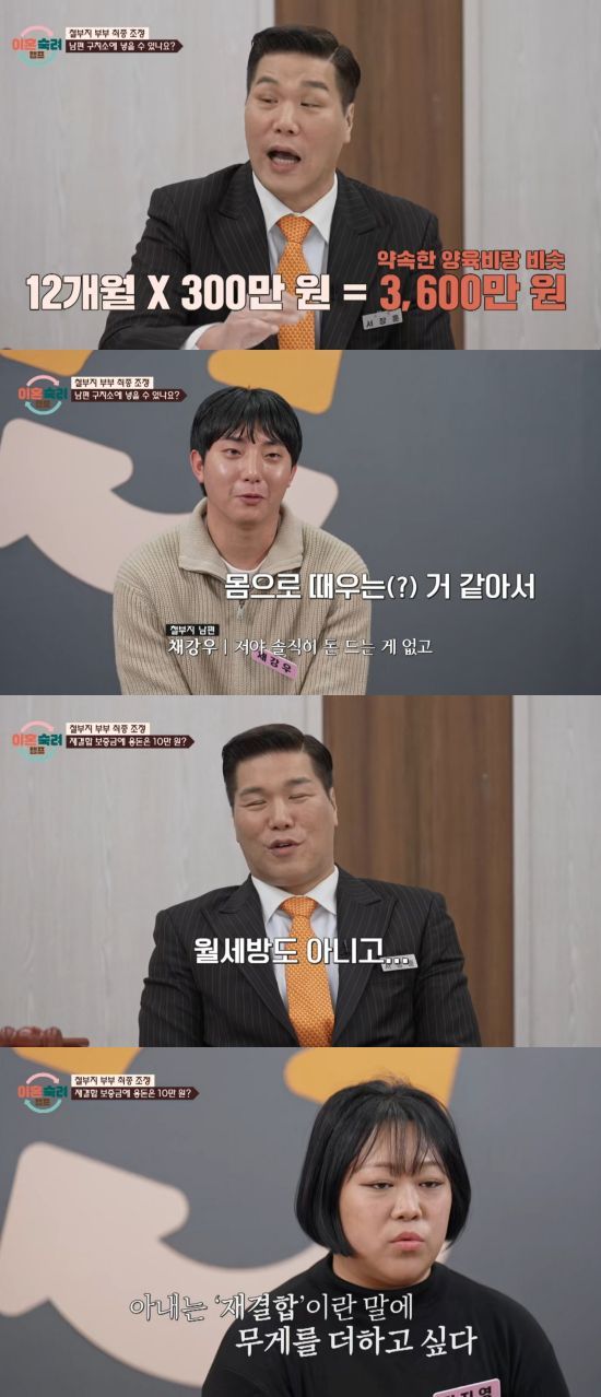 이에 MC 서장훈은 남편이 취업하기 전까지 육아와 가사를 도우면서 밀린 양육비를 차감하는 현실적인 중재안을 내놓았고, 남편은 "저야 솔직히 돈 드는 것도 없고 몸으로 때우는 것 같다"며 만족감을 표해 웃음을 자아냈다.